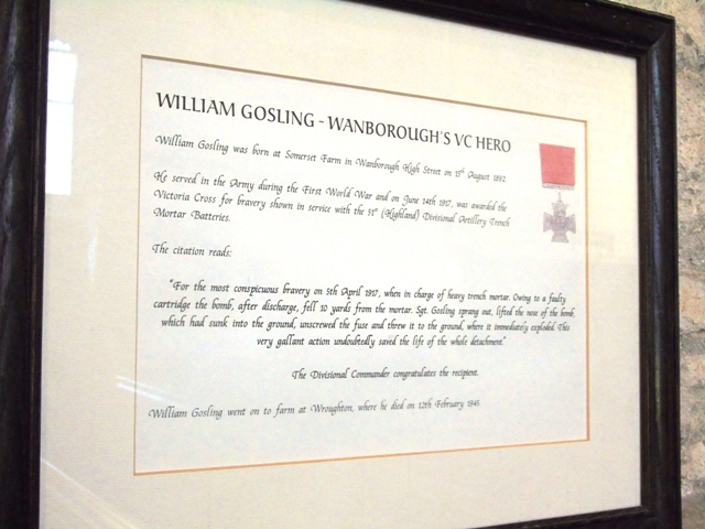 Within the church hangs a dedication to William Gosling, who was awarded the Victoria Cross on June 14th 1917 for acts of bravery shown during the 1st World War. William was born at Somerset Farmhouse on the High Street August 15th 1982. There is a desire to commemorate William with a blue plaque however at the time of writing this project had not yet been accomplished.
