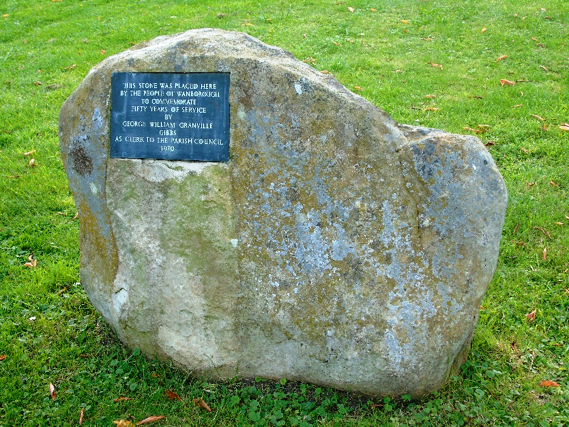 George Gibbs worked tirelessly as the clerk of Wanborough Parish Council for many years. On the 50th anniversary of his becoming Clerk to the Council a memorial stone was laid in his honour on the green beside the bungalows at Box Hedges on the High Street, Wanborough in 1970. The stone being a large sarsen stone, which was found locally and moved to its current location. George is also remembered annually at the